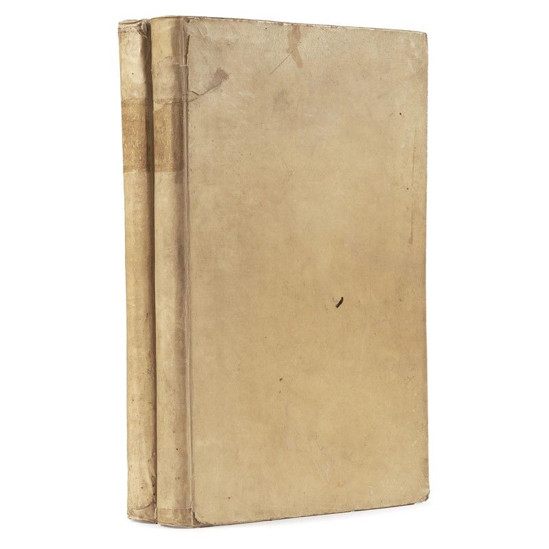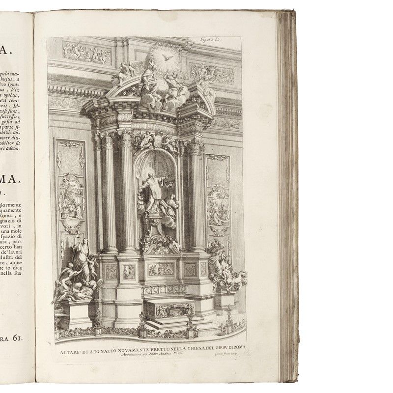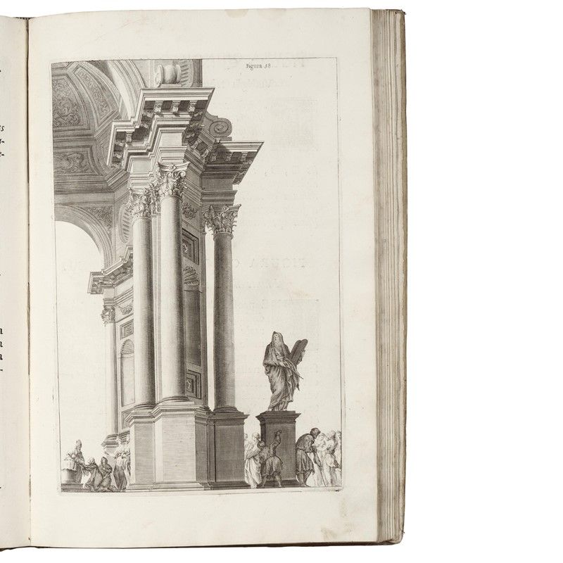 In folio (415 x 272 mm) in pergamena coeva con tassello dorato al dorso (qualche difetto). Primo volume con le seguenti carte: ritratto calcografico dell’Autore in antiporta, 2 carte in latino (frontespizio e dedica), 2 carte in italiano (frontespizio e dedica), tavola calcografica con inscrizione “Perspectiva pictorum et architectorum fratris And. Putei Tridentini. Soc. Iesu 1693”, carta di imprimatur con al verso illustrazione calcografica a piena pagina, 102 illustrazioni architettoniche calcografiche a piena pagina (una ripiegata) precedute dalla relativa didascalia in latino e in italiano. Secondo volume con le seguenti carte: 2 carte di frontespizio (in latino e in italiano), dedica (2 carte in italiano), tavola calcografica allegorica, 2 carte di lettera al lettore (in latino e in italiano), imprimatur, 118 illustrazioni architettoniche calcografiche a piena pagina precedute dalla relativa didascalia in latino e in italiano (a volte una didascalia per più figure), 2 carte di indie (in latino e in italiano), una tavola calcografica con tre figure intente ad affrescare un muro seguita da [8] carte di testo su come affrescare (4 in latino e 4 in italiano). Opera senza segnatura e di difficile collazione. Si presume completa. -- Carte occasionalmente brunite in modo pallido nel secondo volume, qualche strappo, ma nel complesso buona copia.