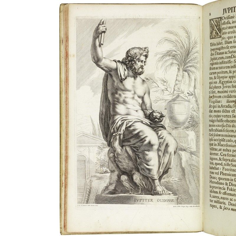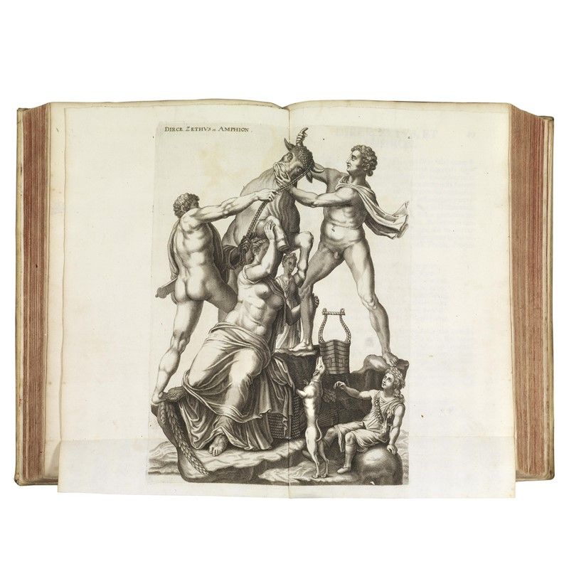 BELL’INSIEME DI OPERE SPLENDIDAMENTE ILLUSTRATE da Joachim von Sandrart (1606-1688), pittore, storico dell’arte e traduttore tedesco. La prima propone una galleria di 70 incisioni che raffigurano statue di divinità e personaggi della classicità (il Laocoonte, le Tre Grazie, ecc.) la seconda, in tedesco e in lettera gotica su due colonne, tratta la raffigurazione sempre di divinità ed eroi antichi, ripresi da note statue greche e romane. L’opera mostra il crescente interesse per l’arte antica nell’alto barocco e la sua influenza sull’arte dell’epoca.