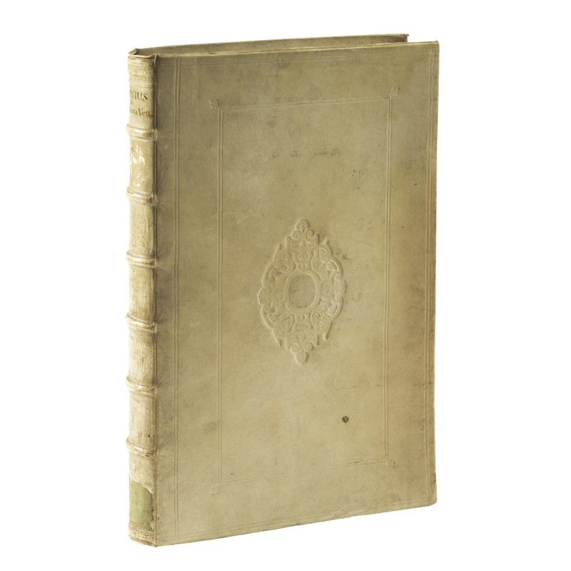 In folio in 2 parti in pergamena rigida coeva olandese con motivo decorativo a mandorla al centro dei piatti, dorso a nervi con titolo anticamente manoscritto. Antiporta allegorica e ritratto di Junius finemente incisi su rame. -- Carte occasionalmente brunite o fiorite in modo pallido, piatti leggermente imbarcati, per il resto buona copia genuina.