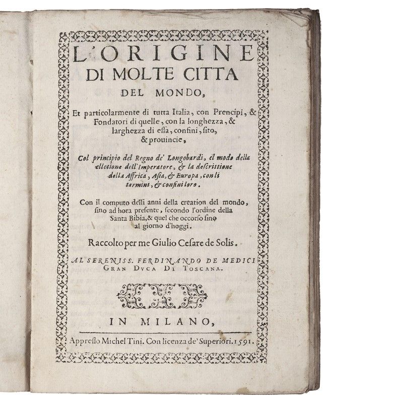 (Città Italiane) DE SOLIS, Giulio Cesare. L’origine di molte città del mondo, et particolarmente di tutta Italia. In Milano, Michel Tini, 1591.