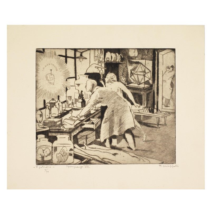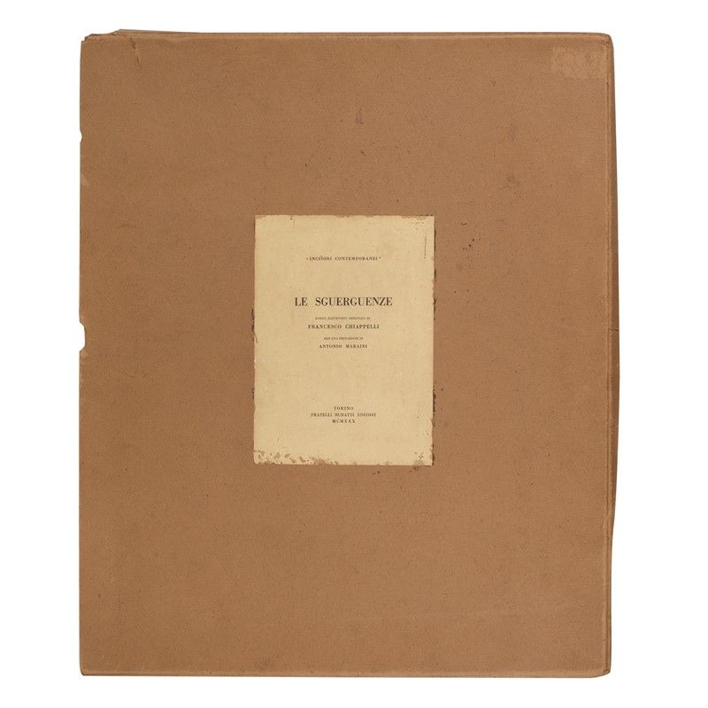 RARISSIMA PRIMA SERIE di 12 acqueforti su rame, edita in 70 esemplari numerati a Torino nel 1930 dai Fratelli Buratti Editori. Al progetto delle “Sguerguenze”, serie di stampe dedicate alle miserie umane, Chiappelli lavorò dal 1928 fino alla sua morte, pubblicando una prima serie di 12 tavole e successivamente, nel 1936, una seconda edizione di 24 tavole. Numerosi disegni e schizzi dell’artista testimoniano la sua volontà di continuare la serie che però rimase interrotta alle tavole pubblicate in seconda edizione. Esemplare “n. 4”, con tutte le tavole singolarmente firmate a matita, numerate “4/70” e titolate. Francesco Chiappelli (1890-1947) è stato un artista, incisore e pittore italiano. Fu eletto nella Print Marker’s Society di Los Angeles tra i 100 migliori acquafortisti del mondo e ricevette il diploma di medaglia d’oro e d’argento all’Esposizione Internazionale di Parigi del 1937. Lo stile delle Sguerguenze è tipico della seconda maniera del Chiappelli: la violenza dei contrasti di bianco e del nero è abolita; è il segno che, nella sua certezza, prende il sopravvento e scandisce la narrazione delle opere.