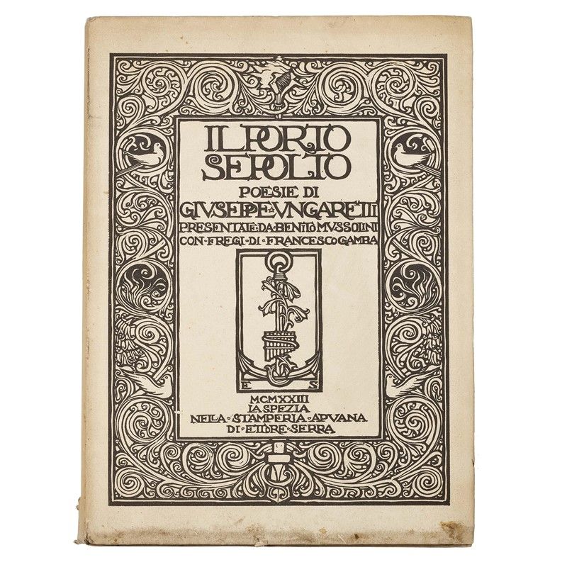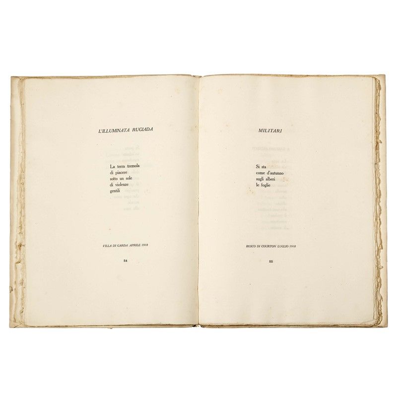 Copia n. 157 di 500 esemplari DI QUESTA MAGNIFICA EDIZIONE IN GRANDE FORMATO, “su carta appositamente fabbricata a mano dalle cartiere Magnani di Pescia”, splendidamente illustrata da Francesco Gamba e con presentazione di Mussolini. Rispetto alla prima del 1916, le revisioni e le integrazioni sono molteplici: contiene 30 (di 33) poesie con variazioni, e 26 poesie (anche queste con variazioni) tratte dall’Allegria di naufragi del 1919, una apparsa in “La Ronda” (1921) e 7 inedite. Uno dei più bei libri del Novecento italiano.
