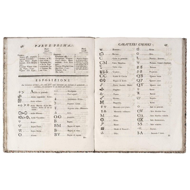 Interessante opera che contiene nella prima parte un elenco alfabetico di minerali, piante, animali e poi caratteri chimici, pesi farmaceutici, ecc.; nella seconda contiene le preparazioni dei medicamenti.