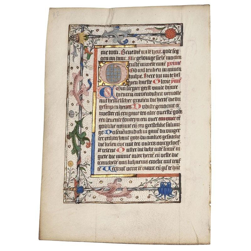 Foglio miniato (186 x 131 mm) da piccolo libro d’ore fiammingo, fine del XV secolo, con bella bordura floreale policroma su tre lati, dettagli in oro e argento, iniziale miniata in rosa, azzurro e oro di 2 per 2,5 centimetri, altre letterine in rosso o blu, lettera gotica.