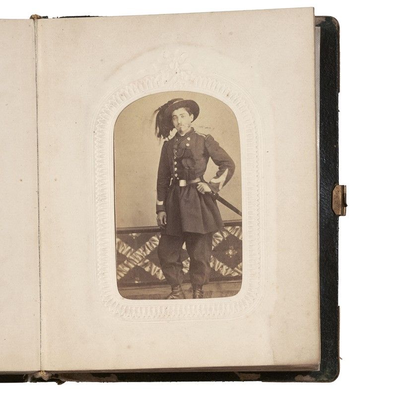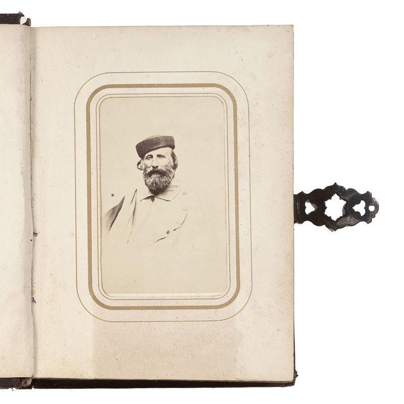 [FOTOGRAFIA]. Lotti di due piccoli album fotografici ottocenteschi. 2 piccoli album fotografici ottocenteschi in piena pelle decorata a secco, con fermagli e tagli dorati, contenenti uno 46 piccole fotografie (40 ritratti e altre 6 con una veduta di Venezia, la statua di Dante, caricature garibaldine ecc.), l’altro 47 ritratti (inclusi uno di Manzoni e uno di Garibaldi).