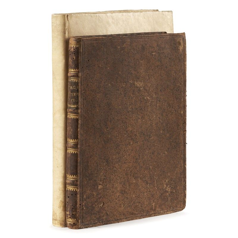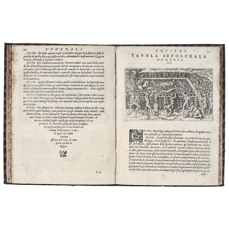 PRIMA EDIZIONE di questo celebre testo illustrato dalle splendide incisioni su rame di Girolamo Porro che, poste in apertura a ciascun capitolo, riproducono scene di cerimonie funebri secondo l’uso degli antichi greci, romani, egiziani, trogloditi, indiani, sciti e cristiani. In 4to in vitellino spruzzato posteriore, grossa macchia d’unto, non collazionato. [CON:] GUASCO, I Riti funebri di Roma pagana, Lucca, Filippo Maria Benedini, 1758. In 4to in pergamena rigida posteriore, frontespizio e carte occasionalmente brunite in modo pallido, non collazionato.