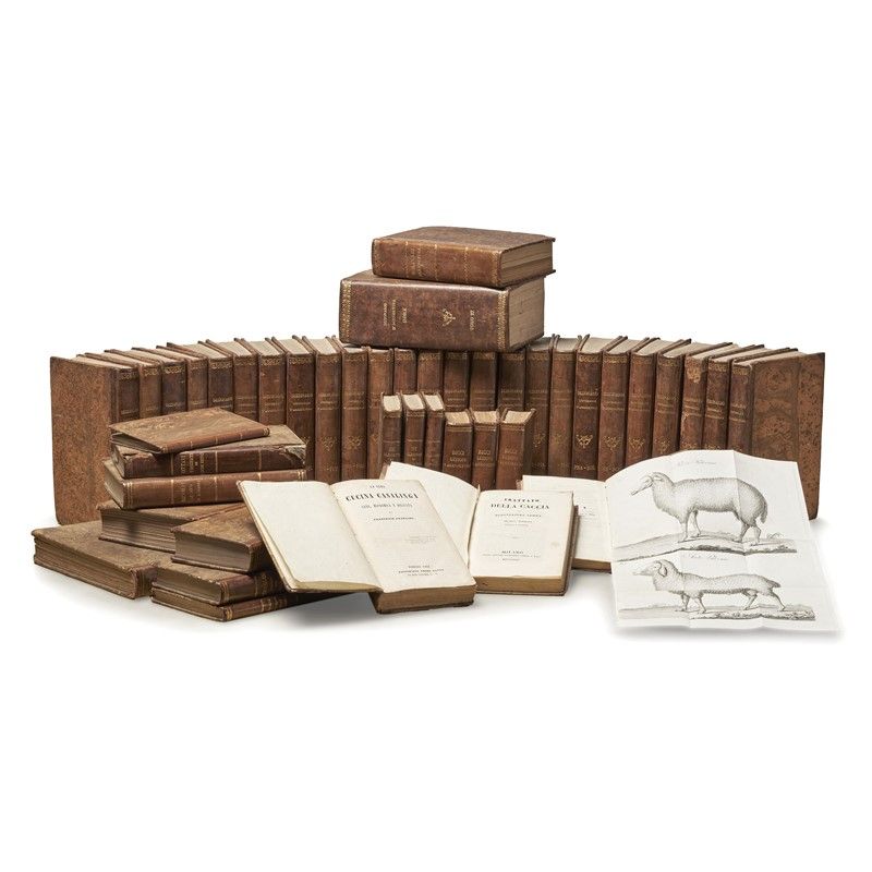 Grosso lotto di 21 opere ottocentesche d’agricoltura, enologia, caccia, cucina e altro, per lo più in mezzo vitellino con titoli e decorazioni al dorso