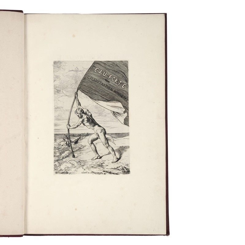 Bella galleria di 96 finissime acqueforti di vario formato e soggetto. La rivista, fondata da Alfred Cadart (1828-1875), fu pubblicata dal 1868 al 1881. In folio in mezzo marocchino rosso coevo con iniziali “E.Q.” al piatto anteriore, dorso a nervi con titoli dorati, contenente le prime due annate della rivista per un totale di 48 48 tavole incise all’acquaforte.