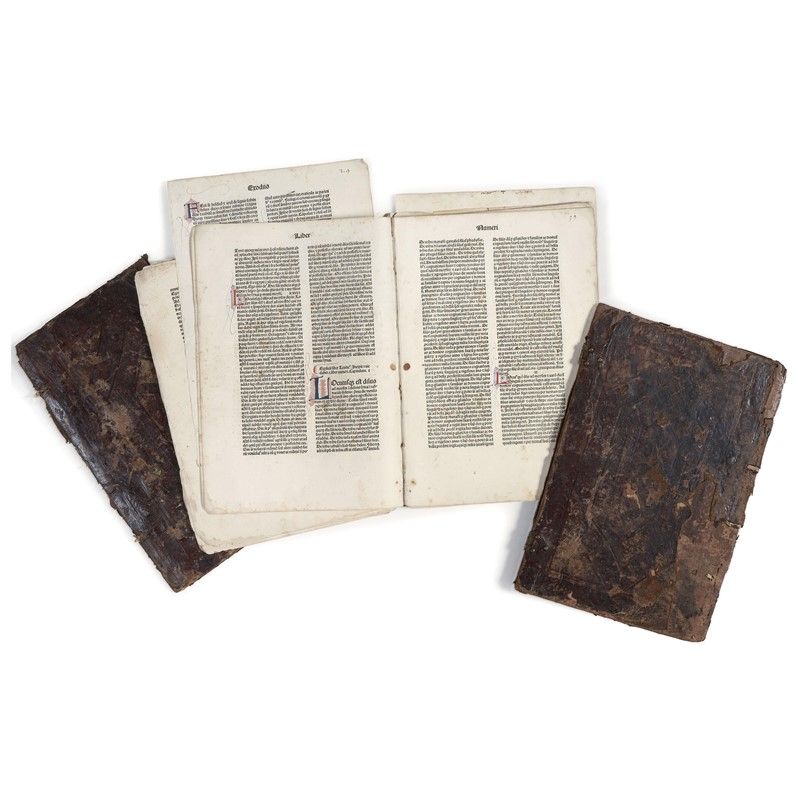 FRAGMENT OF THE CELEBRATE “JENSON BIBLE”, [74 (of 452)] leaves, with fascinating initials illuminated in red and blue. Remains of contemporary wooden boards lined with blind-decorated leather. The ensemble preserved in a modern box. Translation of description and condition report upon request.