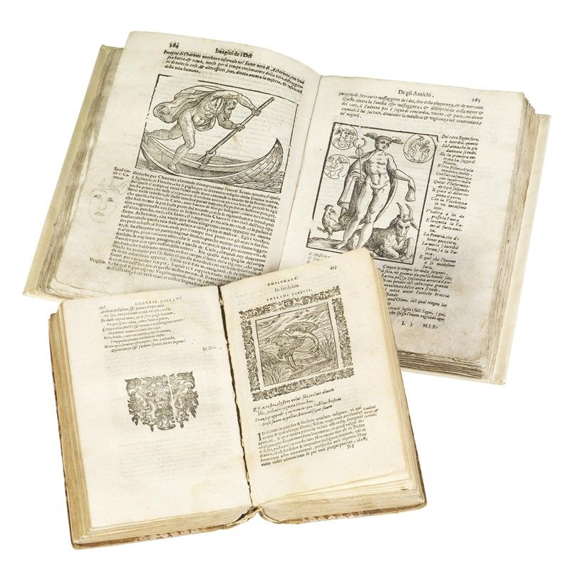 ALCIATI Andrea. Omnia emblemata. Paris, in officina Ioan. Richerii, 1608. In 8vo piccolo in mezza pelle antica, parzialmente slegato, non collazionato ma apparentemente completo e abbastanza pulito. [CON:] CARTARI Vincenzo. Imagini delli dei de gl’antichi. Venezia, Cristoforo Tomasini, 1647. In 4to in pergamena moderna in stile, timbro nobiliare a secco, frontespizio polveroso e con restauri ai margini, altri occasionali restauri marginali ben eseguiti, numerose illustrazioni xilografiche, non collazionato e difetti da esaminare.
