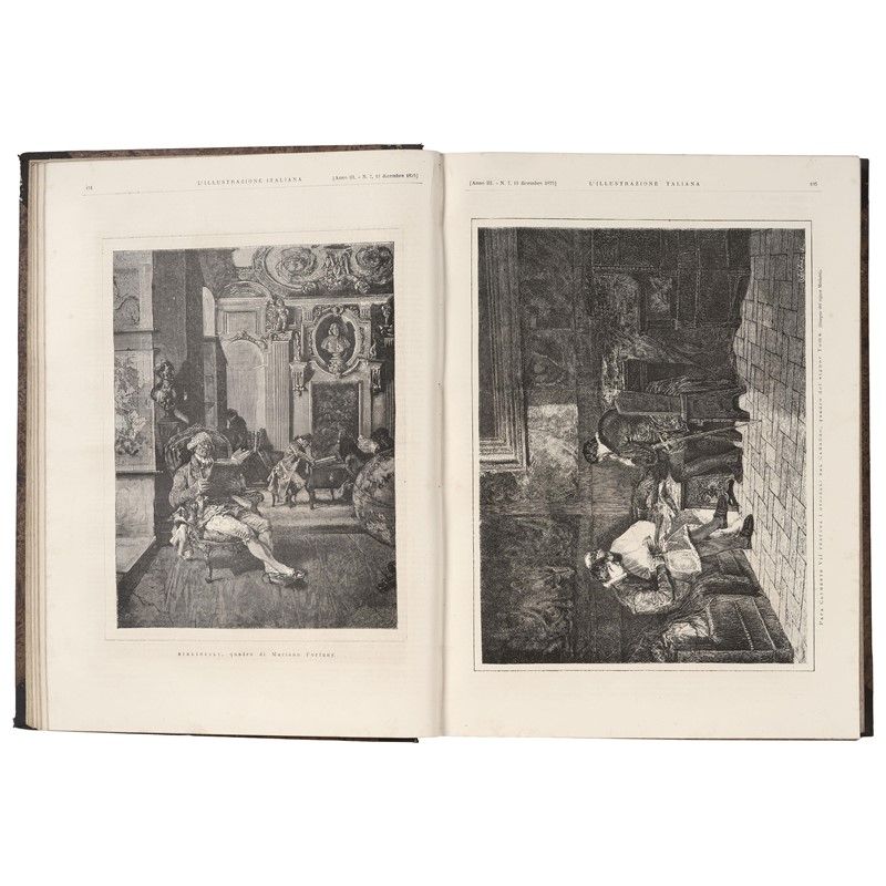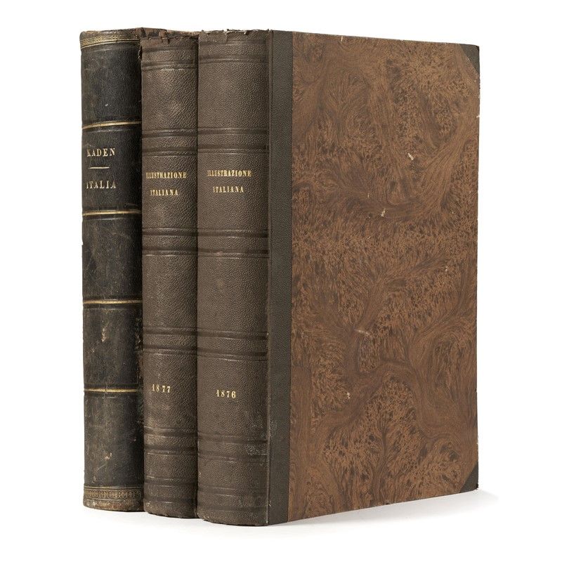 KADEN, Woldemar e altri. Italia. Viaggio pittoresco dall’Alpi all’Etna. Quarta edizione. Milano, Treves, 1890. In folio in mezzo marocchino nero coevo con titoli e filetti dorati al dorso (legatura stanca con sbucciature alle estremità), pagine uniformemente ingiallite, profusamente illustrato, apparentemente completo ma non collazionato. Si allegano due volumi de L’Illustrazione Italiana. Rivista settimanale degli avvenimenti e personaggi contemporanei, anno III, dal n. 1 del 1 novembre 1875 (con le feste in Milano per l’imperatore Guglielmo I di Germania) al n. 62 del 31 dicembre 1876, e poi anno IV, dal n. 1 del 7 gennaio 1877 al n. 52 del 30 dicembre 1877.