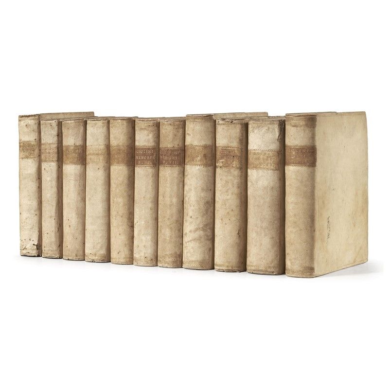 11 (di 12) volumi in folio in pergamena rigida coeva con titolo e decorazioni in oro al dorso, tagli rossi. Numerose tavole calcografiche. – Assente il nono volume delle Memorie, non collazionato e difetti da esaminare.