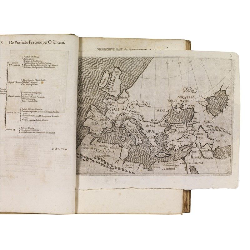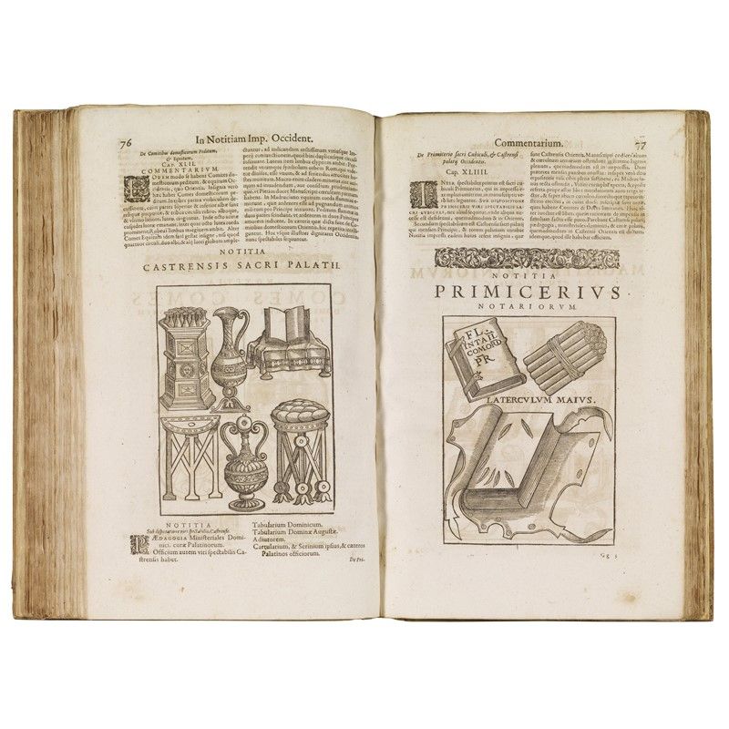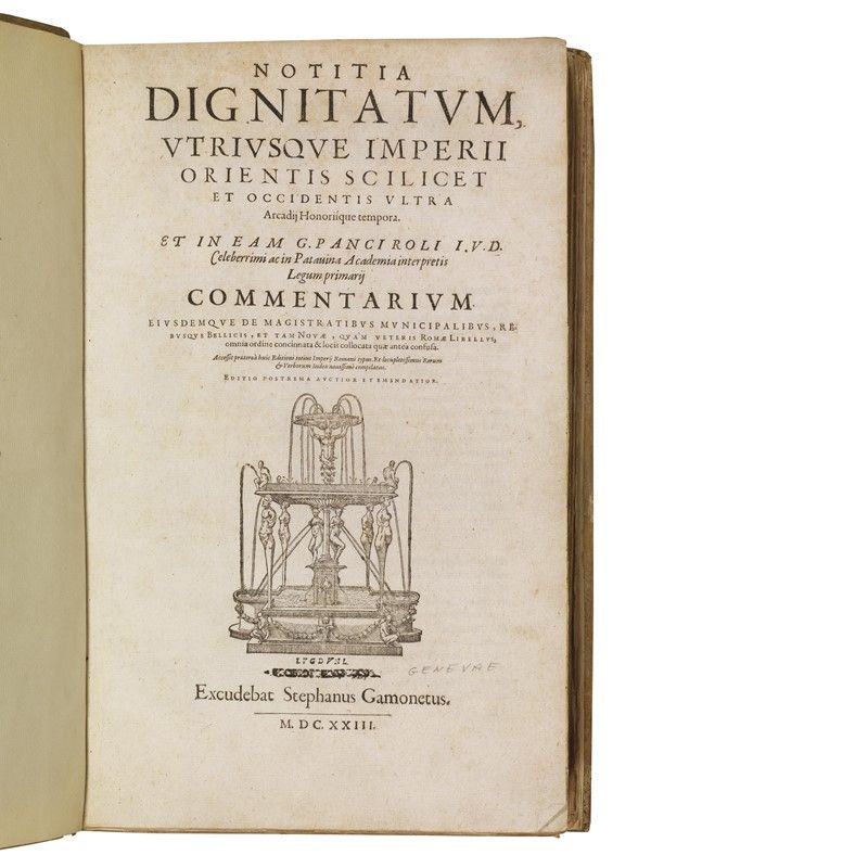 Genevan edition of this study of the political and juridical organization of the late Roman Empire published for the first time in 1552, by Guido Panciroli. Collation, detailed description, condition report and additional images upon request