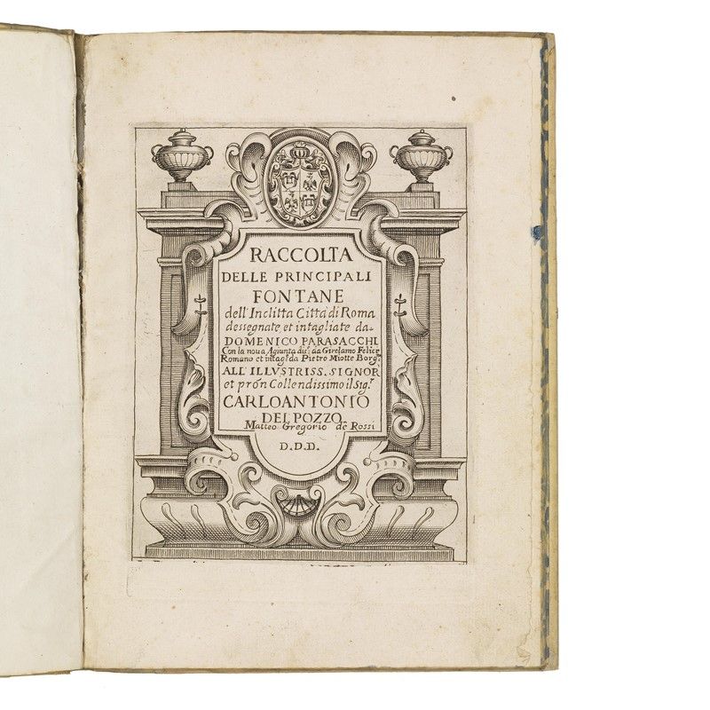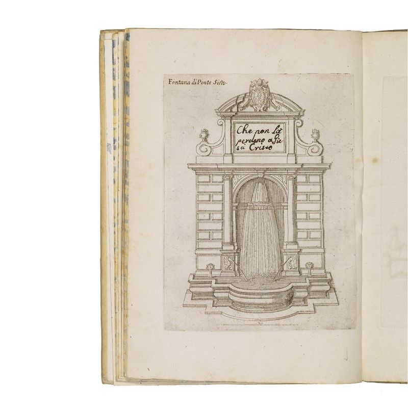 RARA E SPLENDIDA GALLERIA DI FONTANE ROMANE disegnate e incise da Domenico Parasacchi, ampliata da nuove tavole incise da Pietro Miotte su disegni di Girolamo Felice. Queste ultime si distinguono si distinguono facilmente dalle originali di Parasacchi perché sono eseguite in uno stile molto più materico e spesso includono figure impegnate in vari giochi e passatempi. Edizione priva di dati editoriali, ma si presume sia quella del 1647 stampata dal De Rossi visto che il frontespizio mantiene la dicitura “Matteo Gregorio De Rossi D.D.D.” poi cancellata nell’edizione stampata da Carlo Losi nel 1773.