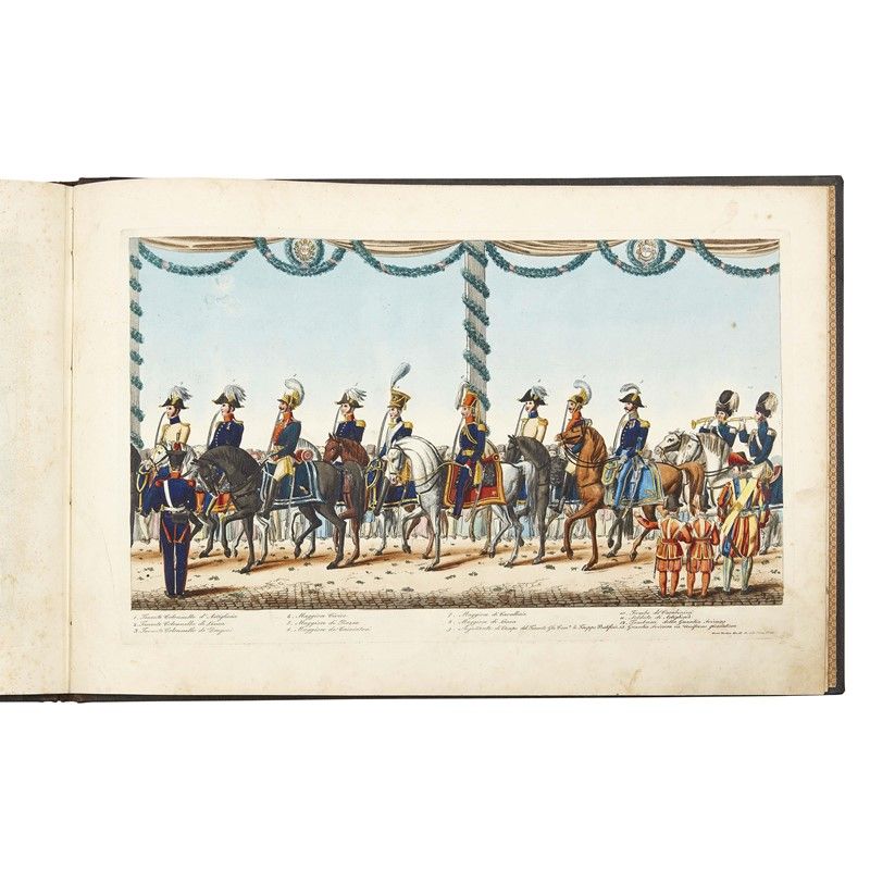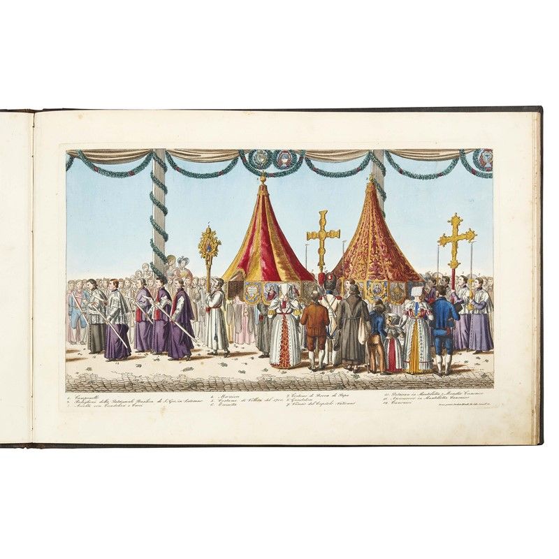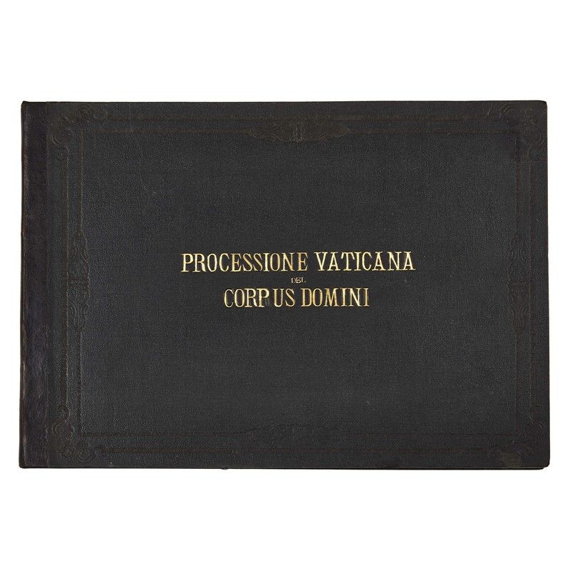 In folio oblungo (327 x 478 mm) in tela nera coeva decorata a secco, titolo in oro al piatto anteriore “Processione vaticana del Corpus Domini”, contenente 35 tavole calcografiche finemente colorate a mano con parti in oro e argento (frontespizio, tavola con la storia della processione in italiano e francese e 33 tavole che illustrano la processione). -- Frontespizio con trascurabile asportazione all’angolo in alto a destra e tracce d’uso in margine, altre carte con tracce d’uso e pallide fioriture marginali, qualche minimo strappetto, ma nel complesso buona copia completa.