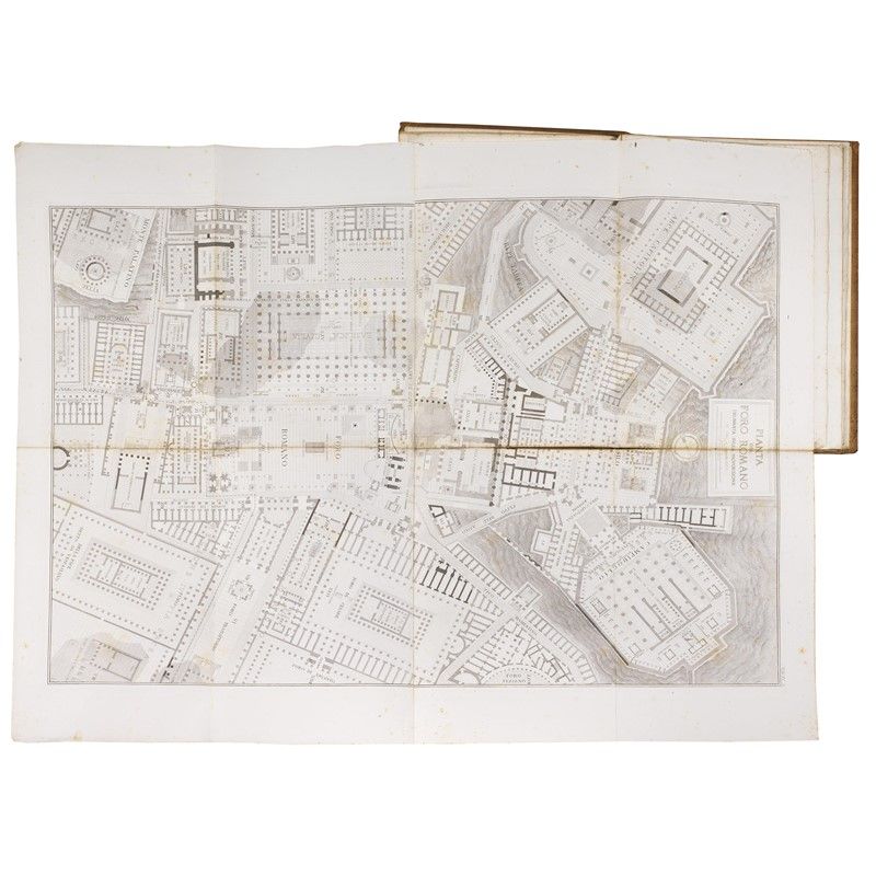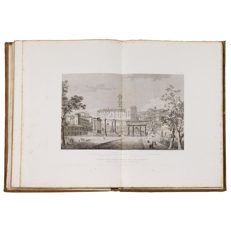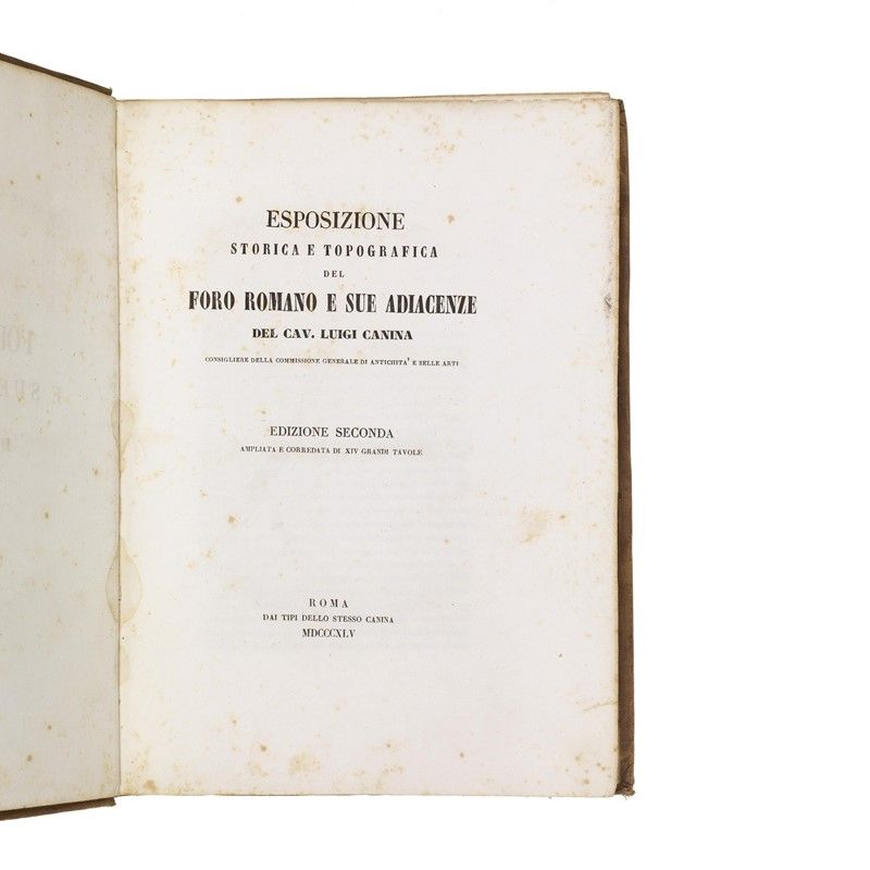 (Roma - Illustrati 800) CANINA, Luigi. Esposizione storica e topografica del Foro Romano e sue adiacenze. Edizione seconda ampliata e corredata di 14 tavole. Roma, tipi del Canina, 1845. 2 volumi di cui uno di testo in 4to uno di tavole calcografiche in folio, legatura in tela rossa molto sciupata, fioriture, tavole sciolte dalla legatura, non collazionati. [CON:] [CANINA, Luigi] Via Appia dalla Porta Capena a Boville. Descrizione. (Roma, 1853). 2 volumi di cui uno in folio con 50 tavole e uno in 4to di 271 pp. e tre tavole incise di cui 2 ripiegate, in mezza pergamena moderna con tassello al dorso. Assente il frontespizio e altri difetti.