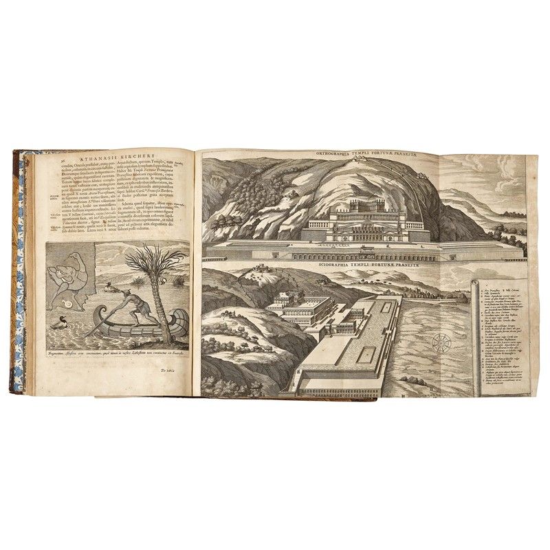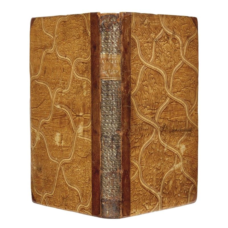 PRIMA EDIZIONE di questa opera di notevole interesse per la storia, l’archeologia e la topografia del Lazio, splendidamente illustrata con raffinate incisioni calcografiche. Athanasius Kircher (1602-1680) gesuita, filosofo, storico e museologo tedesco del XVII secolo, giunse a Roma nel 1635 e dedicò molto tempo allo studio della città e dei suoi dintorni, sia analizzando fonti antiche e moderne, sia recandosi sui luoghi oggetto dei suoi approfondimenti. Paragonato a Leonardo da Vinci per la sua enorme varietà di interessi, insegnò per più di quarant’anni nel Collegio Romano, dove allestì una wunderkammer.