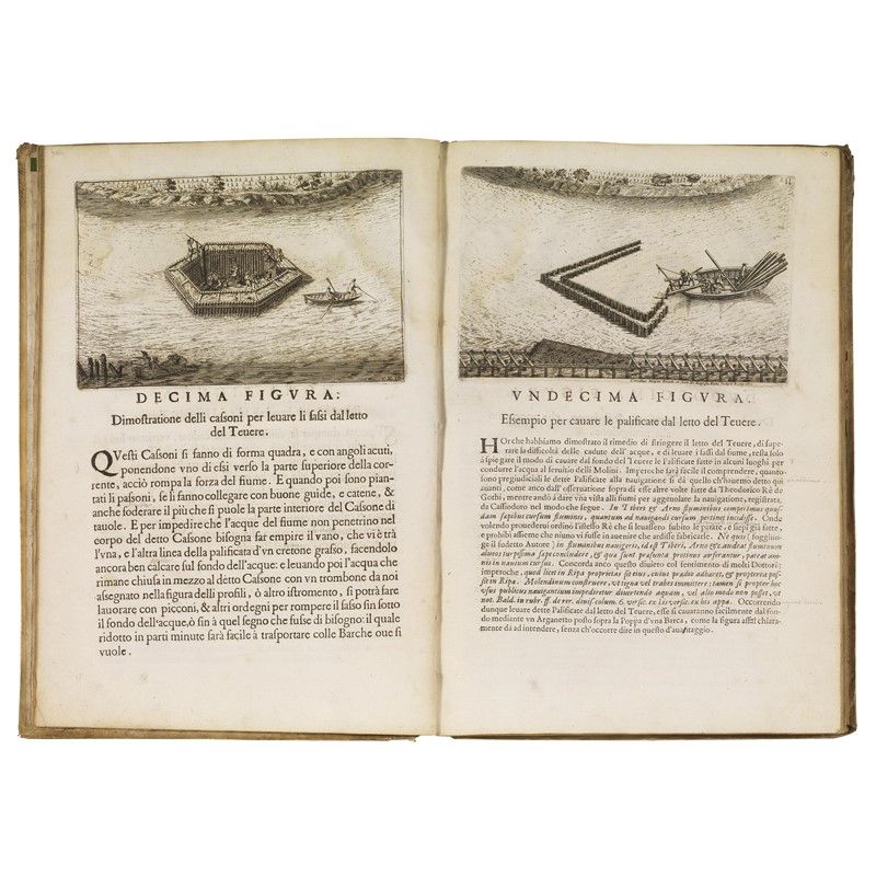 Seconda edizione, dopo la prima del 1683, dell’importante opera del Meyer sul ripristino del fiume Tevere per la navigazione, l’agricoltura e altri usi. Ingegnere idraulico olandese, Meyer tratta di erosione, flusso, chiuse e sbarramenti, navigazione da Roma fino al mare e prosciugamento delle paludi pontine, facendo una varietà di proposte per monumenti, colonne, ecc. nelle piazze e nelle chiese di Roma. Le raffinate tavole includono vedute fluviali e panorami della città che raffigurano le invenzioni di Meyer, inclusa una carrozza non trainata da animali ma funzionante (in piano) grazie a un motore meccanico. Cornelis Janszoon Meijer (1629-1701) fu un ingegnere olandese che trovò fortuna in Italia lavorando prima per il granduca di Toscana Cosimo III, e poi per papa Innocenzo XI, dedicatario della presente opera.