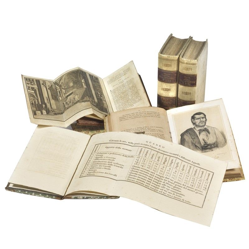 (GABRIELLI, Pompeo). Regolamento concernente il servizio interno, la polizia e la disciplina della truppa pontificia a cavallo. Roma, Ajani, 1817. In 8vo in mezza pelle coeva, tavola ripiegata in fine con gli orari degli appelli, pagine uniformemente ingiallite, collazionato completo. RARISSIMO testo reperito in sole due biblioteche italiane. [CON:] CARDINALI, Emidio. I briganti e la Corte Pontificia. Ossia la cospirazione borbonico-clericale svelata. Livorno, Davitti, 1862. 2 volumi in cartonato moderno, 24 tavole di ritratti litografici nel primo volume, 6 nel secondo (totale: 30 tavole), bruniture e fioriture, testo non collazionato. [CON:] SPADA, Giuseppe. Storia della rivoluzione di Roma. Firenze, G. Pellas, 1868-1869. 2 volumi in 8vo (il primo contenente i primi due tomi dell’opera, il secondo il terzo tomo) in pergamena coeva con doppio tassello al dorso, secondo volume pallidamente brunito, non collazionati. [CON:] CANCELLIERI, Francesco. Description des Chapelles papales de Noel, de Paque et de S. Pierre dans le Basilique Vatican. Roma, Bourlié, 1818. In 8vo piccolo, frontespizio inciso con vignetta e 2 belle tavole incise (una ripiegata), pagine uniformemente ingiallite, pieno marocchino nocciola decorato in oro ai piatti e al dorso (abrasioni).