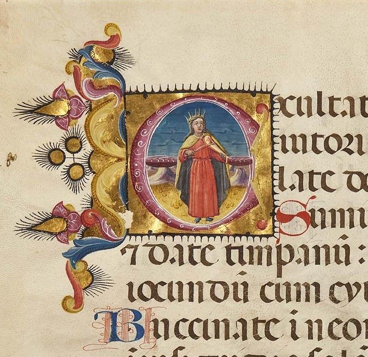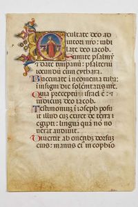 L’iniziale apre il testo “Exsultate Deo adjutori nostro, jubilate Deo Jacob” (Esultate lodando Dio, aiuto nostro; alzate voci di giubilo al Dio di Giacobbe), prima frase del Salmo 80, che ha come oggetto la celebrazione delle feste e del culto di Dio. La figura inserita nella “E” è un giovane coronato che suona una ribeca, strumento musicale ad arco a vario numero di corde e dimensioni diverse, costituito da una cassa di legno a forma oblunga, molto diffuso nell’Europa tardo medievale.