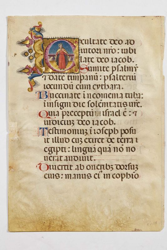 Emilian school, ca. 1460/70. Initial illuminated with rebec player at the opening of Psalm 80. Translation of description and condition report upon request