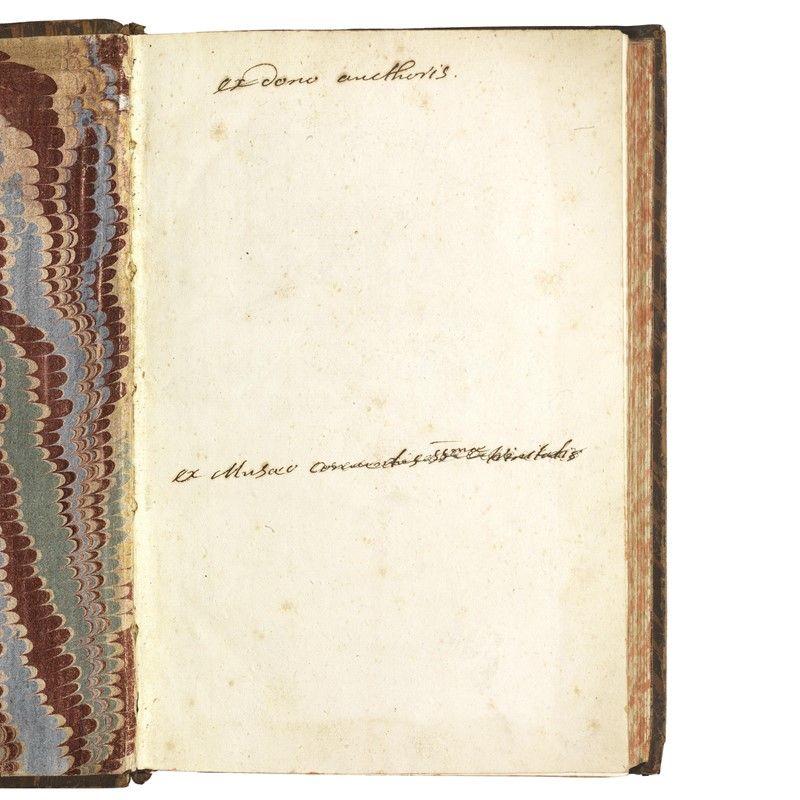 COPIA DI DONO DELL’AUTORE di uno tra i primi eruditi trattati sulle maschere sceniche utilizzate nelle rappresentazioni di tragedie e commedie nei teatri romani. L’opera è corredata da 85 raffiguranti le diverse e molteplici maschere teatrali. Francesco de’ Ficoroni (1664-1747) è stato un antiquario, archeologo, collezionista ed erudito che dedicò la lunga vita allo studio dell’antichità e alla formazione di un’insigne collezione.