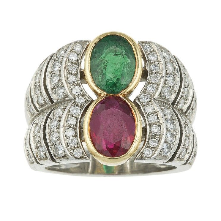 Capello. Anello con rubino Thailandia, smeraldo e piccoli diamanti