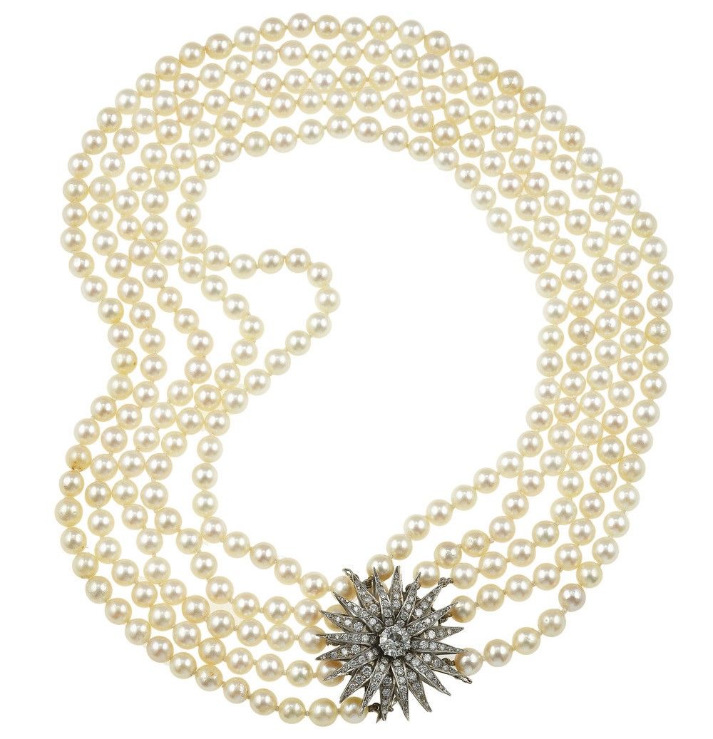 Collana a cinque fili di perle coltivate. Fermezza con diamanti di vecchio tagli [..]