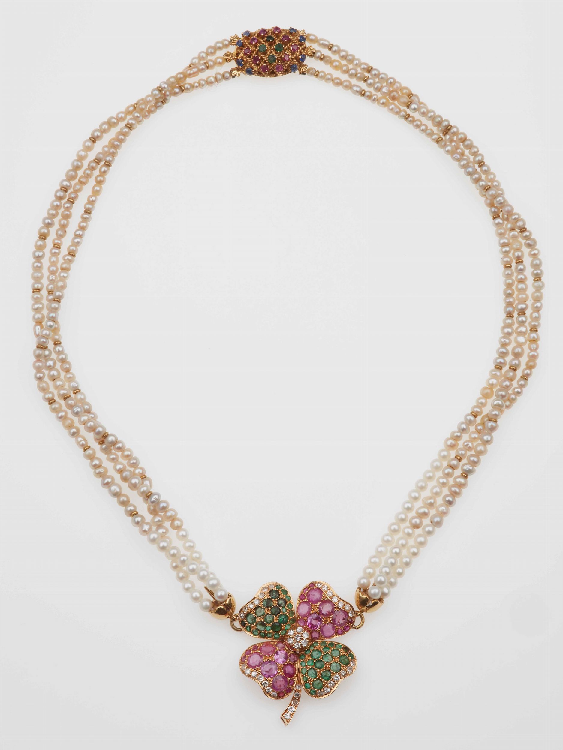 Collana quadrifoglio con piccole perle, rubini, smeraldi, diamanti e zaffiri
