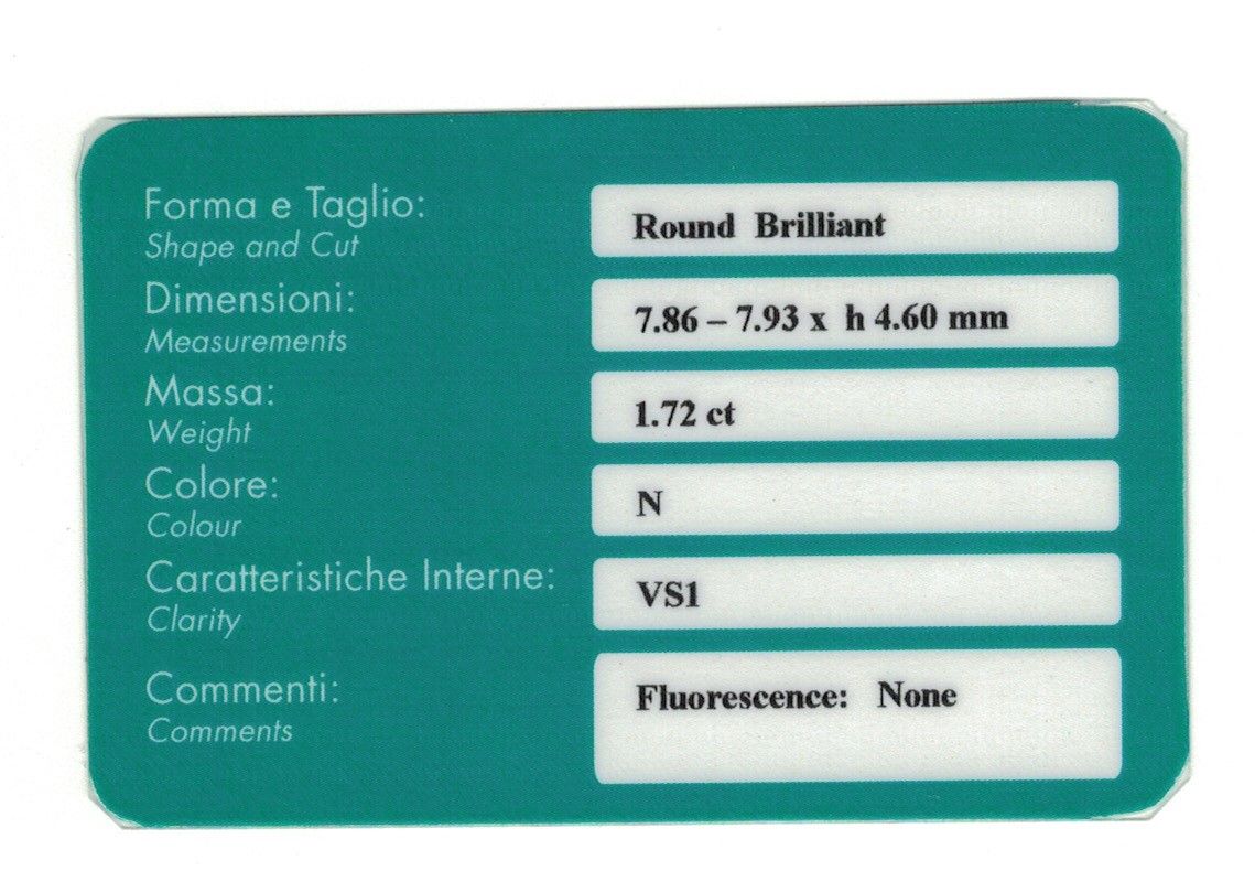 Diamante taglio brillante di ct 1.72, colore N, caratteristiche interne VS1, fluorescenza [..]