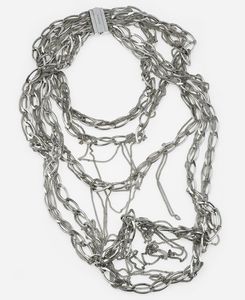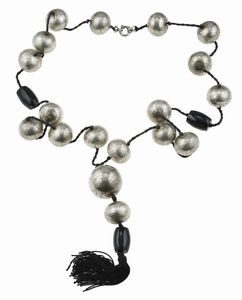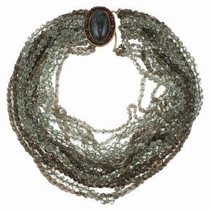 Lotto composto da tre pendenti con vetri, metallo argentato e cristallo di rocca