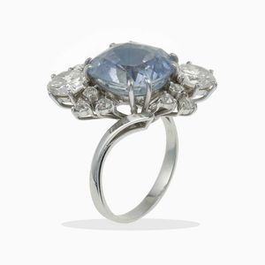 Anello con zaffiro, evidenze di trattamento termico, e diamanti