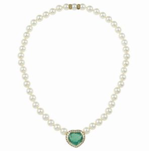 Collana con perle coltivate e pendente con smeraldo Colombia taglio cuore di ct [..]