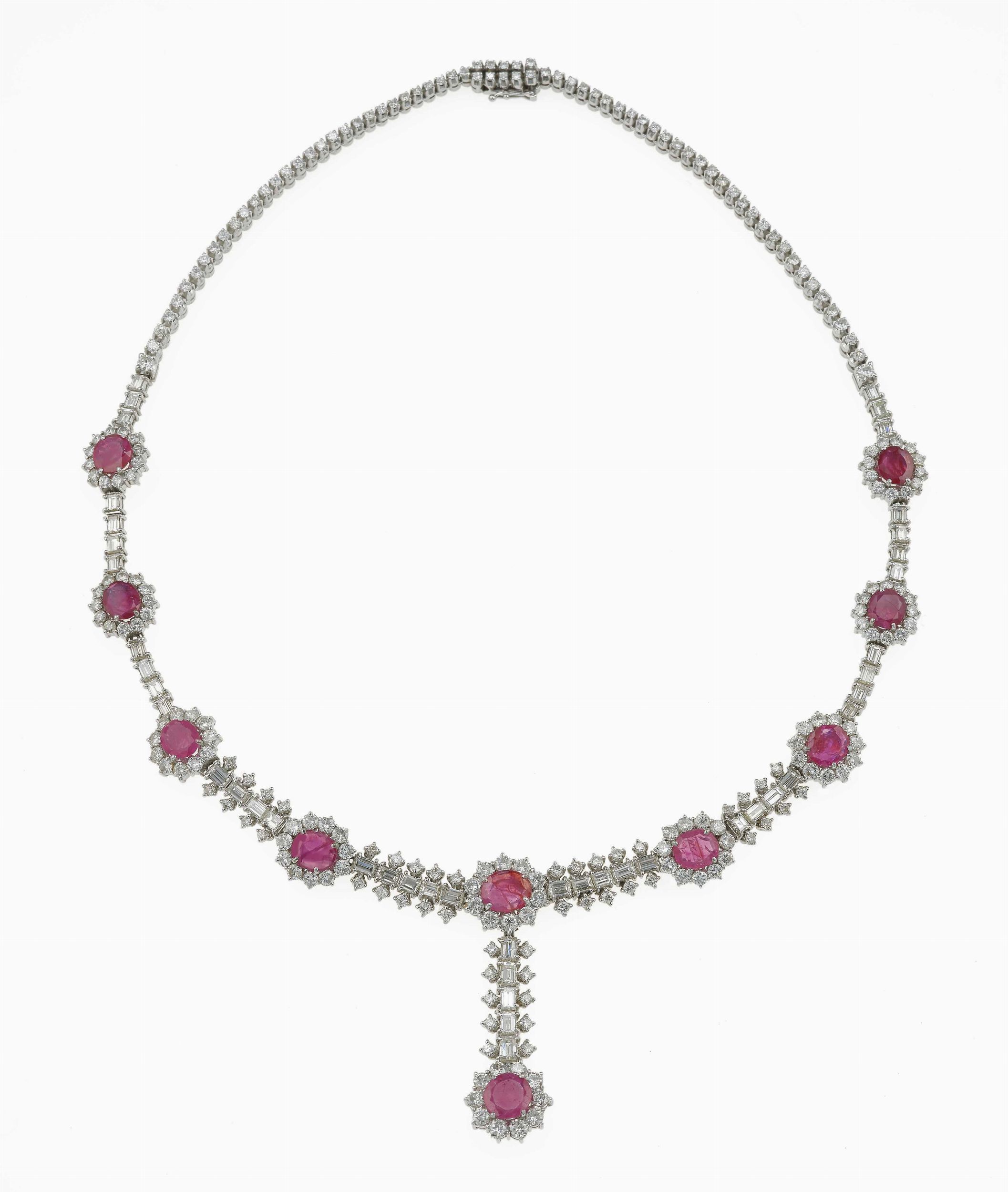 Girocollo con rubini Burma e diamanti taglio brillante e baguette