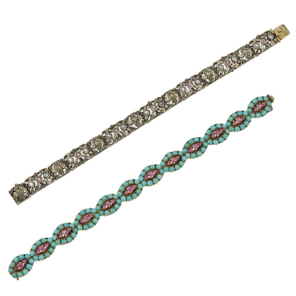 Lotto composto da due bracciali, uno con turchesi e rubini, uno con rubini e piccoli [..]