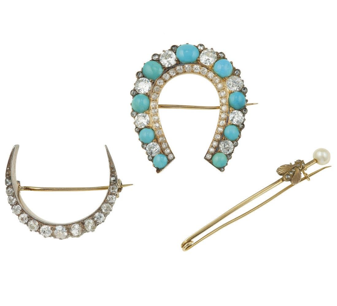 Lotto composto da tre spille con diamanti, turchesi e perla