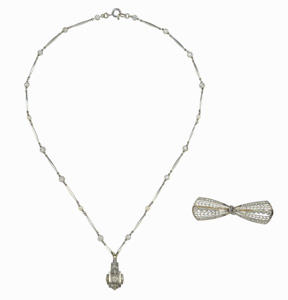 Lotto composto da un girocollo con pendente e una spilla con perle e diamanti