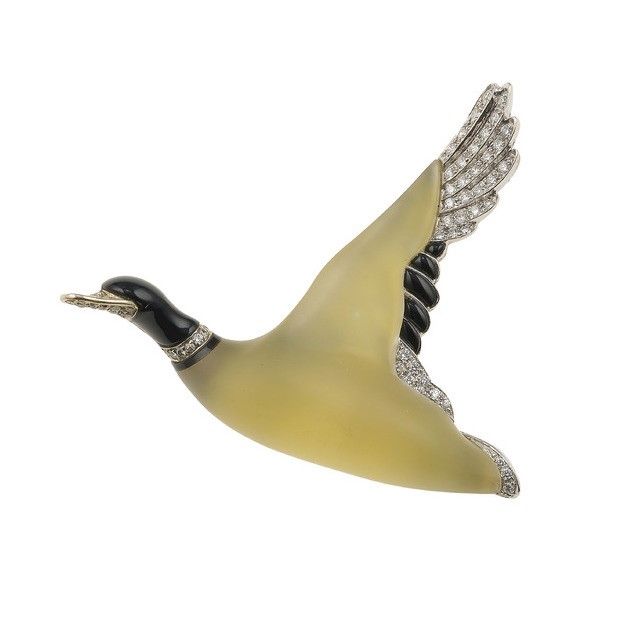 Spilla anatra con cristallo di rocca, smalto e piccoli diamanti