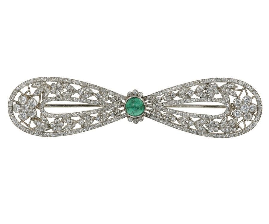 Spilla fiocco con diamanti e smeraldo taglio cabochon