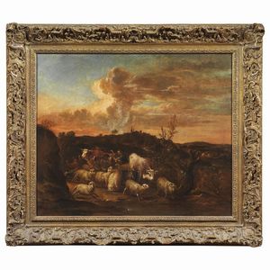 Scuola olandese, fine sec. XVII PASTORI CON ASINELLI E GREGGE olio su tela, cm 56x77,5 Dutch school, late [..]