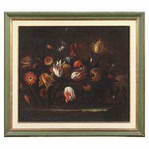 Scuola napoletana, sec. XVII NATURA MORTA CON CESTA DI FIORI olio su tela, cm 50,5x57,5 Neapolitan school, [..]