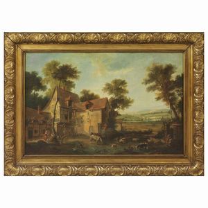 Scuola fiamminga, sec. XIX PAESAGGIO AGRESTE CON CASOLARE, CONTADINI E ANIMALI olio su tela, cm 68x103 Flemish [..]