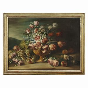 Scuola Italiana, sec. XX NATURA MORTA CON FIORI E FRUTTA olio su tela, cm 73x101 Italian school, 20th century [..]