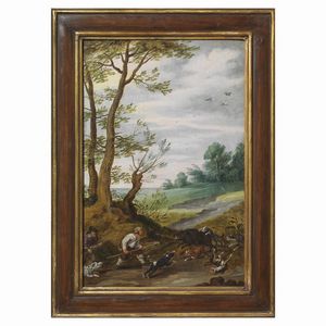Scuola veneta, sec. XVI SCENE DI CACCIA coppia di dipinti olio su tavola, cm 43x28 (2) Venetian school, 16th [..]