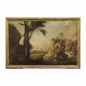 Scuola fiamminga, sec. XVIII PAESAGGI CON PASTORI E ARMENTI coppia di dipinti, olio su tela, cm 67x79 (2) Flemish [..]