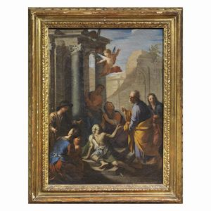 Scuola francese sec. XVIII SAN PIETRO RISANA UN INFERMO olio su tela, cm 50x37,5 French school, 18th century [..]