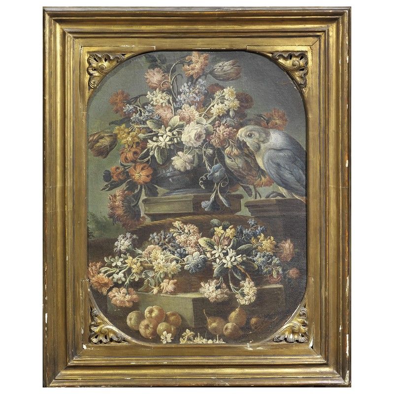 NATURA MORTA CON PAPPAGALLO E FIORI