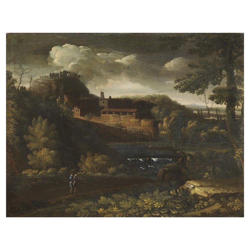 RIVER LANDSCAPE WITH FIGURES AND A VILLAGE IN THE BACKGROUND