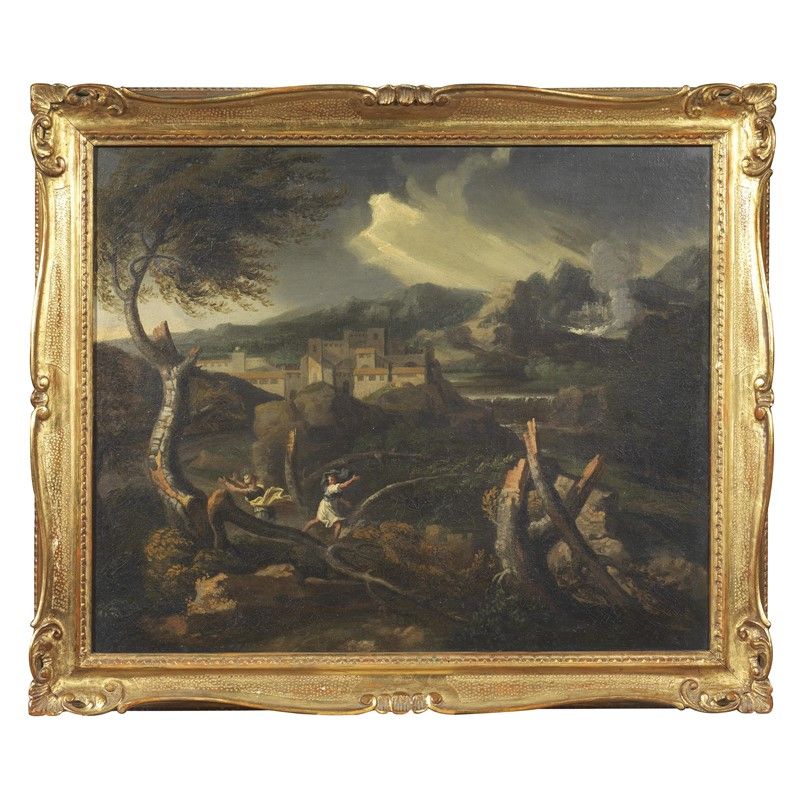 Roman school, 18th century LANDSCAPE WITH LIGHTING oil on canvas, cm 54x65