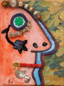 Polimaterico su stoffa, cm 24x18 (opera) - cm 38x32 (cornice) 1974 Firma E. Baj sul retro Provenienza: [..]